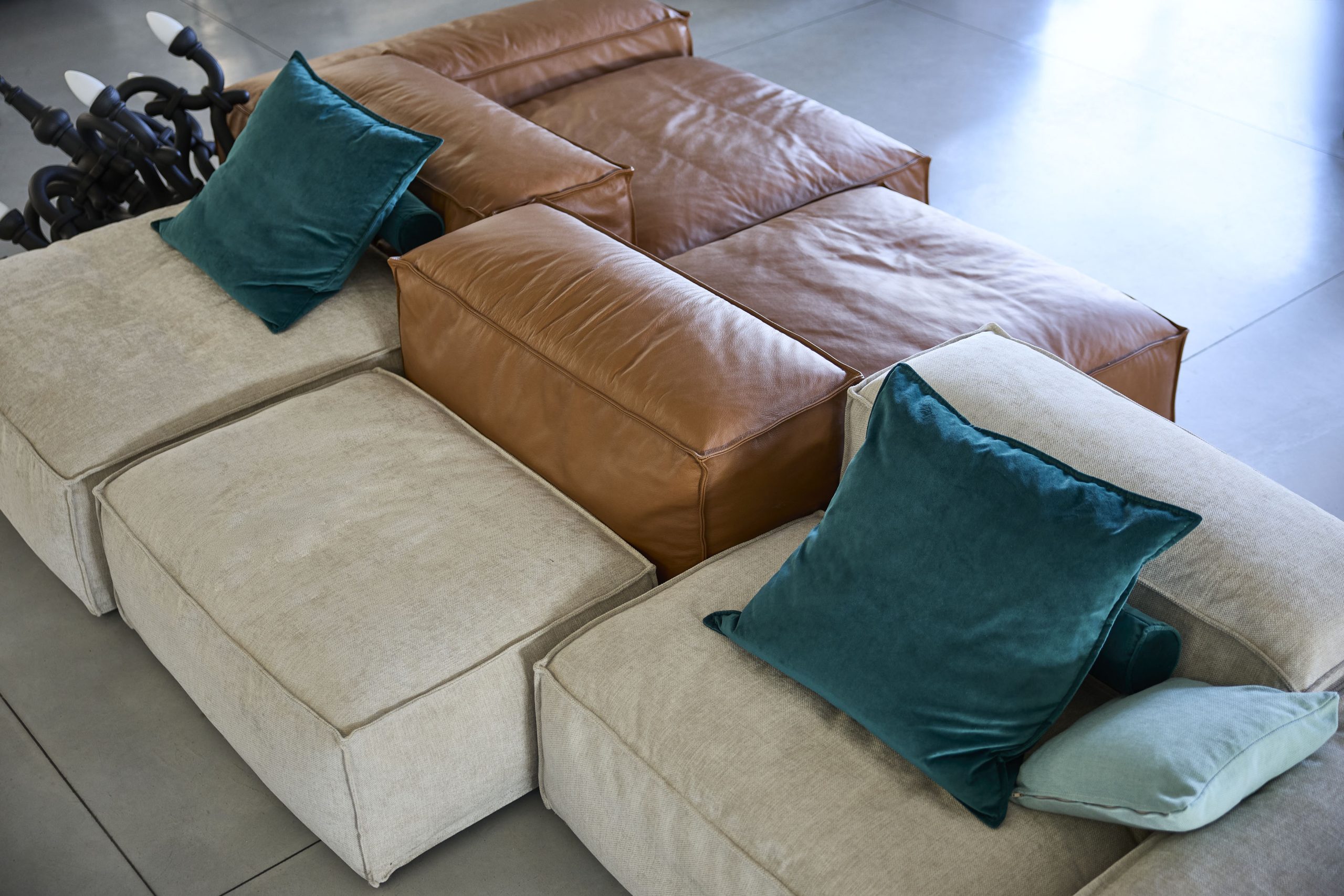 N.1 Armrest 109x38xh52cm (M2001 - Dallas leather 36)N.2 Backrests 100x38xh66cm (M2010 - Dallas leather 36)N.4 Seats 100x71xh40cm (M2013 - n.3 Dallas leather 36 - n.1 Aida velvet with parrots)N.1 Seat 100x100xh40cm (M2015 - Dallas leather 36)N.2 Cushions with roll 65x65cm (CUS/03 - Aida velvet 805)N.1 Cushion 65x65cm (CUS/01 - Aida velvet 502)N.2 Cushion 45x45cm (CUS/02 - Horo fabric 807)